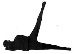 Lie on side. Turn the toes inward on the right foot and lift leg upward. Repeat
